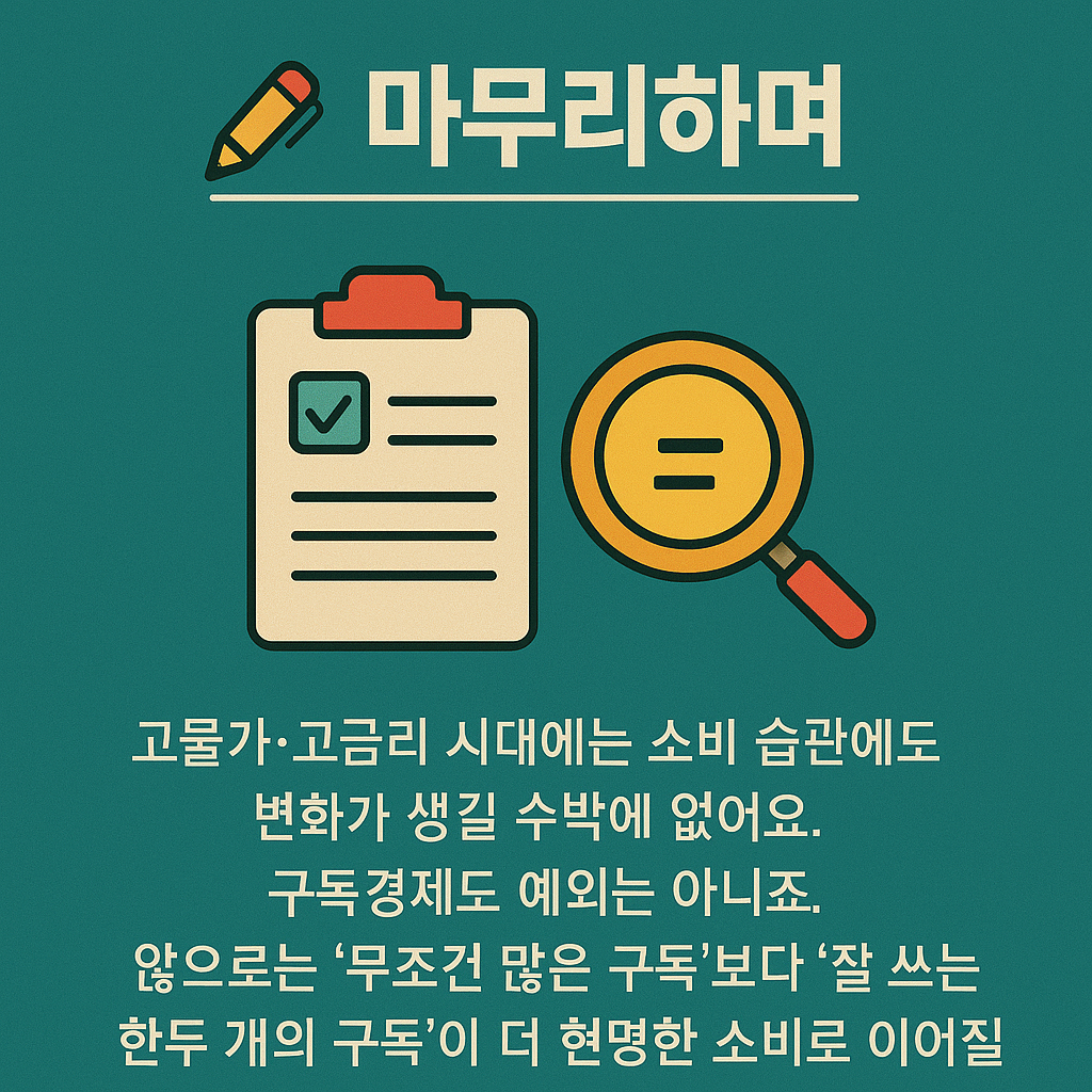 고물가·고금리 시대에는 소비 습관에도 변화가 생길 수밖에 없어요. 구독경제도 예외는 아니죠. 앞으로는 ‘무조건 많은 구독’보다 ‘잘 쓰는 한두 개의 구독’이 더 현명한 소비로 이어질 거예요. 여러분도 이번 기회에 자신의 구독 내역을 점검해보는 건 어떨까요?