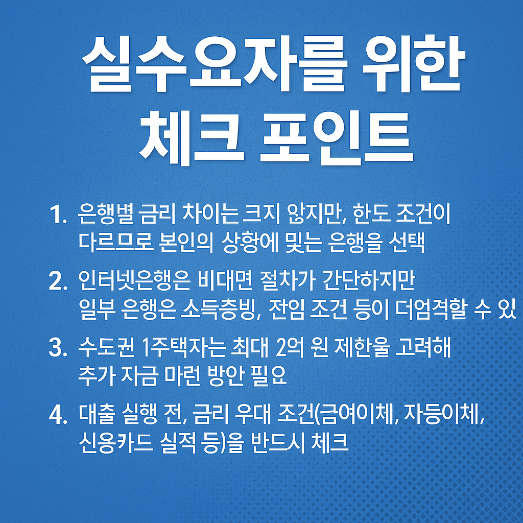 문제는 금리보다 대출 한도입니다. 아무리 금리가 낮아도 필요한 금액을 빌리지 못하면 실질적인 혜택을 보기 어렵습니다. 따라서 무주택자라면 최대 3억 원까지 가능한 은행을 우선 검토하는 것이 유리하며, 수도권 1주택자는 금리뿐만 아니라 추가 조건(자동이체, 급여이체, 신용카드 사용 등)을 꼼꼼히 확인해야 합니다.