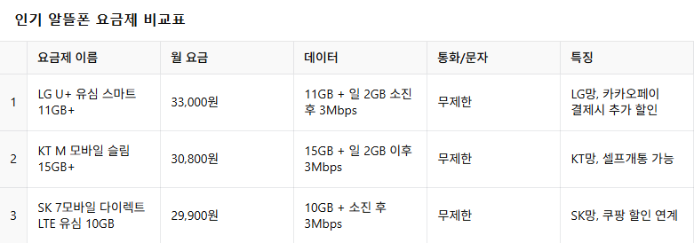 💡 TIP: 가격만 보지 말고, 데이터 소진 후 속도(3Mbps 보장 여부),