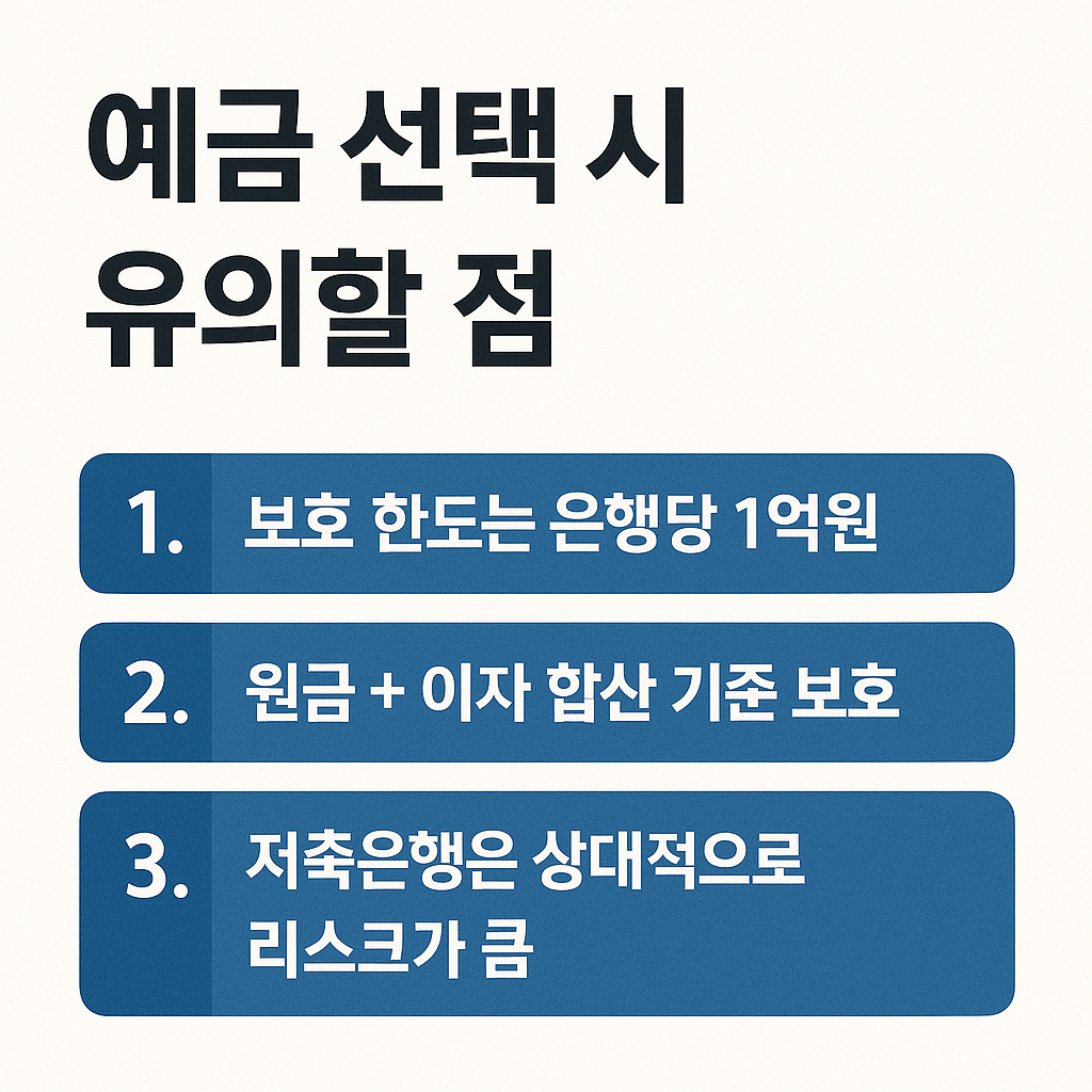 예금자보호가 확대되었다고 해도 몇 가지 주의할 부분이 있습니다. 보호 한도는 은행당 1억 원이므로, 다수 은행에 분산 예치하면 더 안정성을 확보할 수 있습니다. 원금 + 이자 합산 기준으로 보호되기 때문에, 1억 원을 꽉 채워 넣으면 발생 이자가 일부 보장 대상에서 제외될 수 있습니다. 시중은행 대비 높은 금리를 주는 저축은행은 상대적으로 리스크가 크다고 평가되므로, 반드시 예금자보호 여부와 은행 건전성을 함께 확인하는 것이 중요합니다.