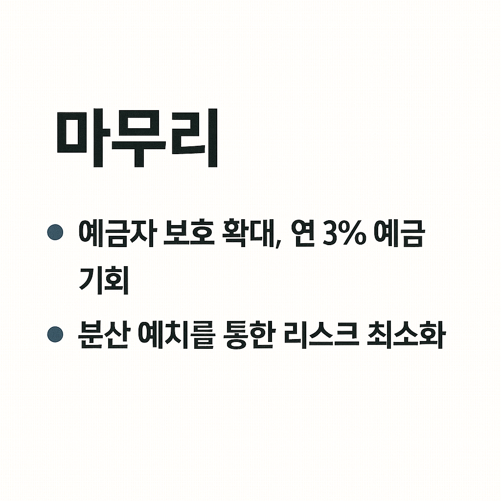 오늘부터 시행되는 예금자보호 확대는 많은 개인 투자자들에게 안전판이 되어줄 제도 변화입니다. 여기에 아직 남아 있는 연 3%대 예금 상품은 저금리 기조 속에서도 자산을 안정적으로 불릴 수 있는 좋은 기회라 할 수 있습니다. 다만 상품 조건과 한도를 꼼꼼히 확인하고, 분산 예치를 통해 리스크를 최소화하는 전략이 필요합니다. 금융 환경이 빠르게 변하는 만큼, 지금이야말로 자신의 예·적금 포트폴리오를 다시 점검해야 할 시점입니다.