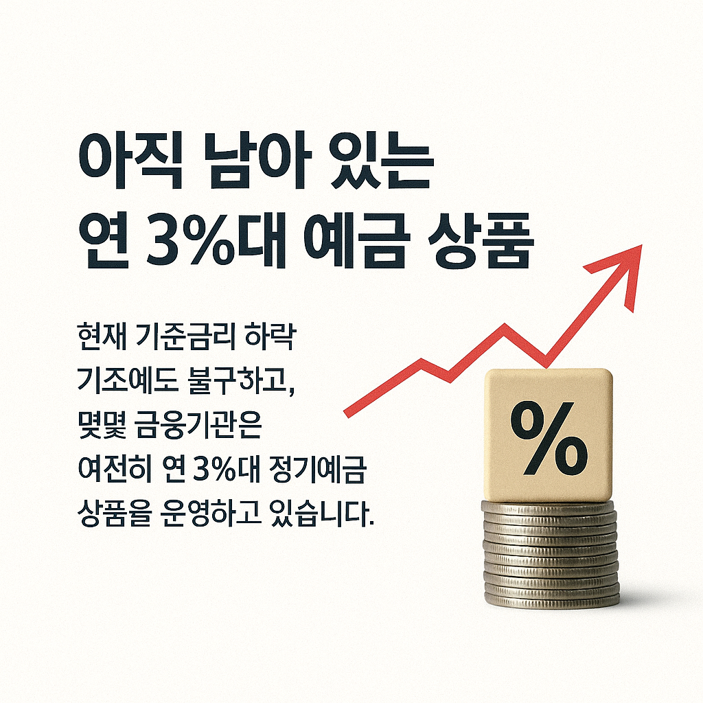 현재 기준금리 하락 기조에도 불구하고, 몇몇 금융기관은 여전히 연 3%대 정기예금 상품을 운영하고 있습니다. 대표적으로 울산 강남새마을금고의 블록예금은 연 3.7% 금리를 제공하며, 추가 입금 및 분할 인출이 가능한 유연한 구조를 갖추고 있습니다. 또한 DB저축은행과 HB저축은행 역시 연 3.2~3.3% 수준의 예금 상품을 유지하고 있어, 금리 방어를 원하는 고객들의 선택지가 되고 있습니다. 다만 대부분의 3%대 상품은 한도가 정해져 있거나 특정 조건(온라인 가입, 자동이체 설정 등)을 충족해야 한다는 점을 유의해야 합니다.