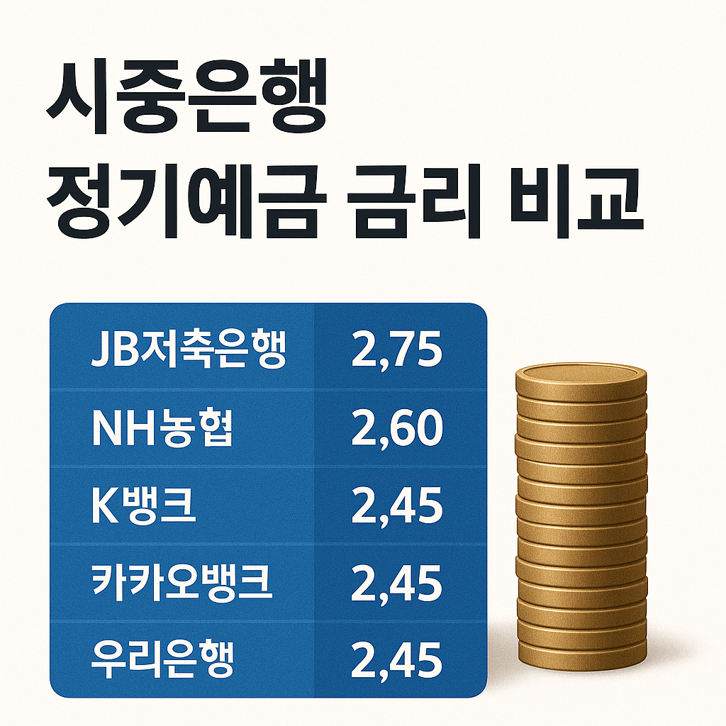 시중은행의 평균 정기예금 금리는 2%대 중후반에 머물러 있습니다. JB저축은행: 2.75% NH농협: 2.60% K뱅크: 2.45% 카카오뱅크: 2.45% 우리은행: 2.45% 이처럼 주요 은행의 금리가 2%대에 그치고 있는 상황에서, 3%대 예금 상품은 여전히 매력적인 선택지라고 볼 수 있습니다.