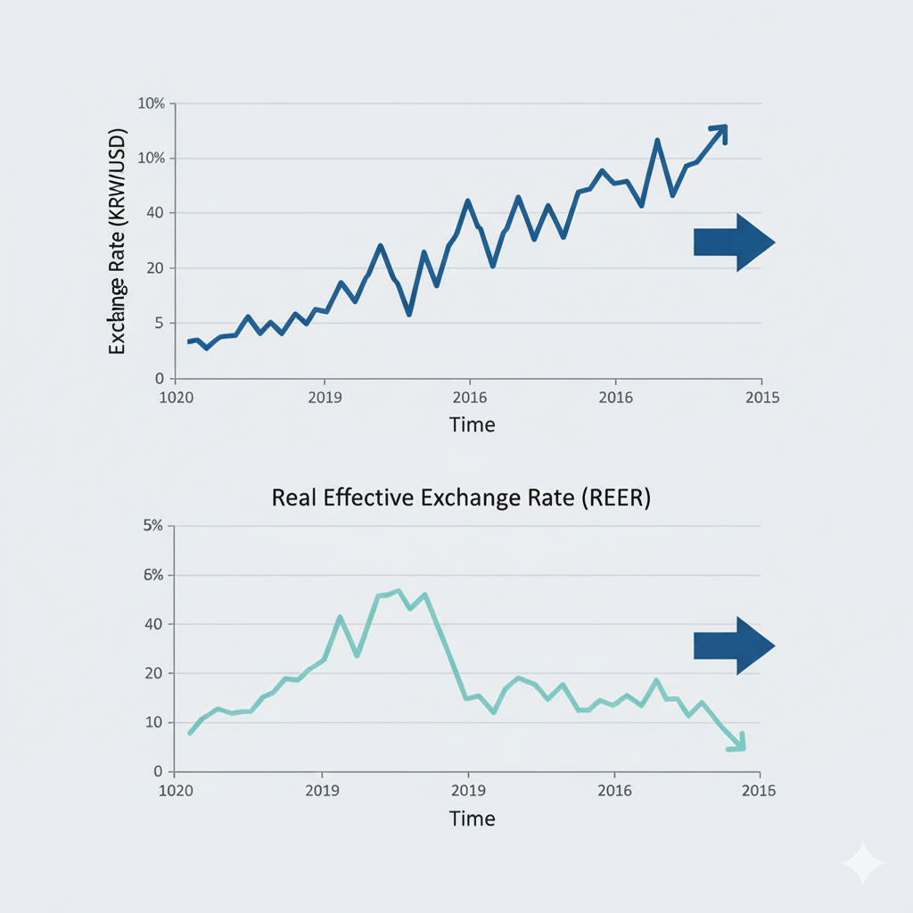 두 번째로 눈여겨볼 오늘의 경제 이슈는 원화가치 하락입니다. 실질실효환율이 90.87까지 떨어지면서 한국인의 구매력이 글로벌 금융위기 후 가장 낮은 수준을 기록했다고 하네요. 명목 환율만 보면 체감이 잘 안 오지만, 실제 우리 생활비·수입 물가·여행 비용에 직결되는 지표라 개인적으로도 민감하게 보는 편입니다.